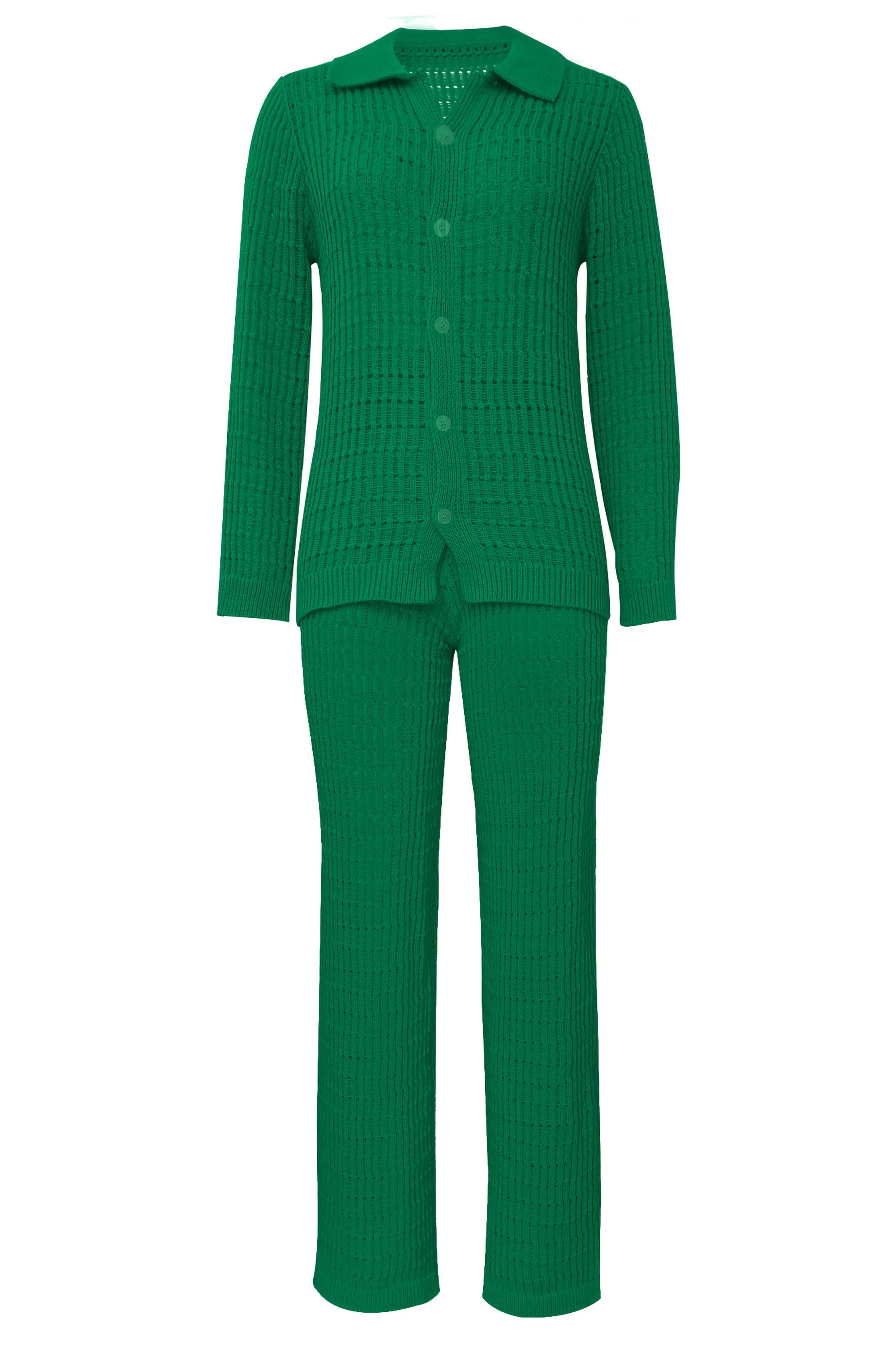 Green Ribbed Knit Two Piece Shirt And Pants Set